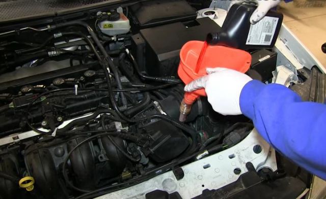 - Затем через заливное отверстие, которое расположено в подкапотном пространстве, необходимо при помощи воронки залить свежий состав.