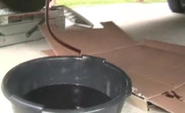Если все сделано правильно, то с одной из сторон поддона начнёт активно выливаться масло. Подставляем приготовленную заранее ёмкость и ждём полного слива отработанной жидкости.