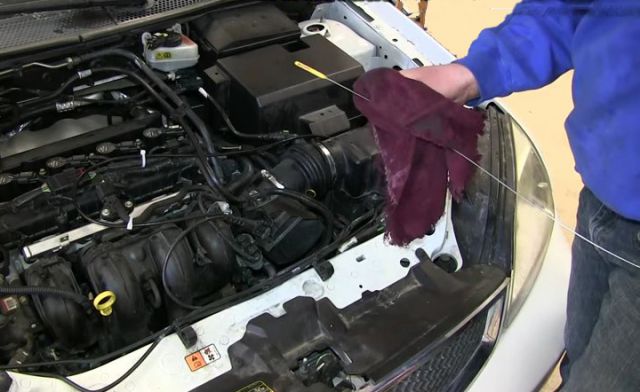Проверка масла в АКПП выполняется сразу после поездки, чтобы жидкость в коробке была прогрета до рабочей температуры 66-77 С°. Прежде чем извлечь указатель уровня жидкости, тщательно удаляем загрязнения с поверхности двигателя и в непосредственной близости от него.