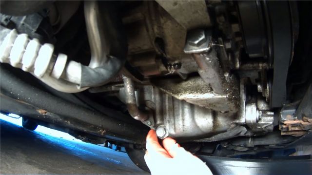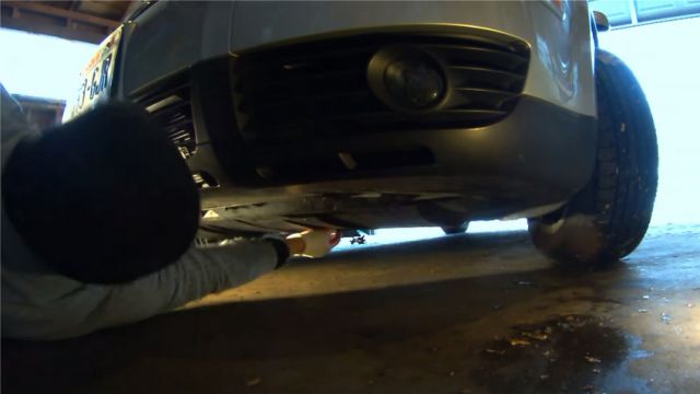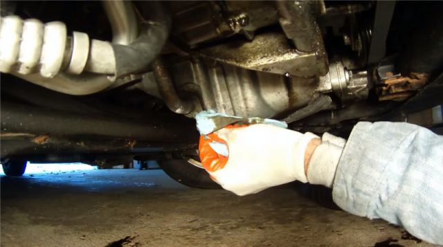 3. Снизу автомобиля, снимаем защиту, если такая имеется. Откручиваем сливную пробку ключом 19 мм, сливаем масло, и закручиваем пробку на место.