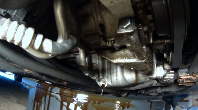 Ослабить сливной болт ключом и открутить руками, заранее подставив емкость для отработанного масла.