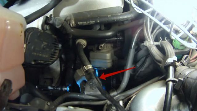 Откручиваем три самореза, снимаем фишку датчика уровня, и отодвигаем расширительный бочок. У нас появился доступ к фильтру, подкладываем под него старую ветошь, так, как с него вытечет грамм 100 — 200 масла. И откручиваем его.