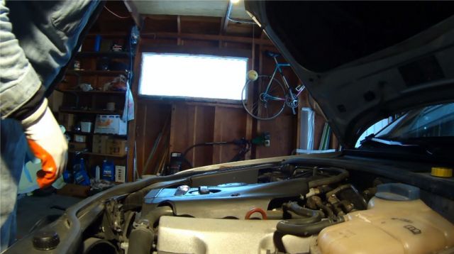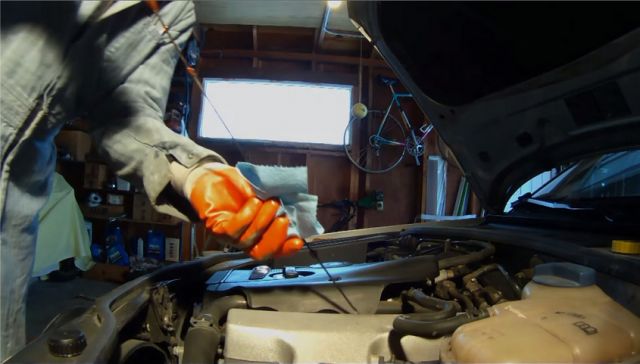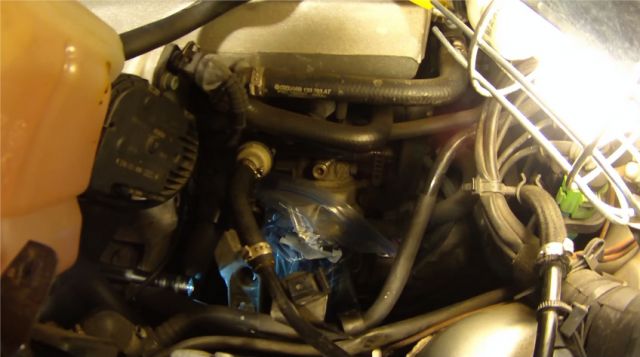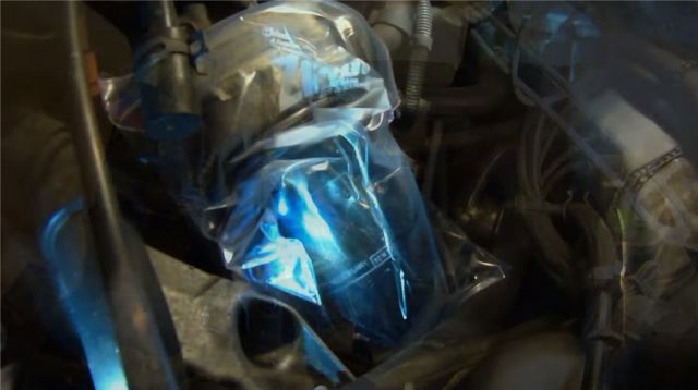 Откручивать масляный фильтр лучше с накинутым на него пластиковым пакетом, поскольку масла выльется при этом изрядно. Но прежде чем снимать старый фильтр придется открутить и отодвинуть в сторону расширительный бачок.