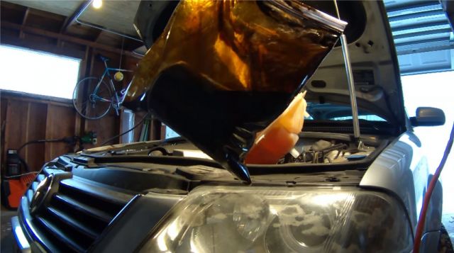 Как видно, пакет – не пустая предосторожность. Из фильтра выльется довольно много масла, которое явно лишнее в подкапотном пространстве.