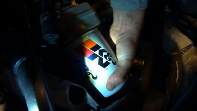 Закрутить руками новый фильтр, предварительно наполнив его свежим маслом, и им же смазав уплотнительное кольцо фильтра.