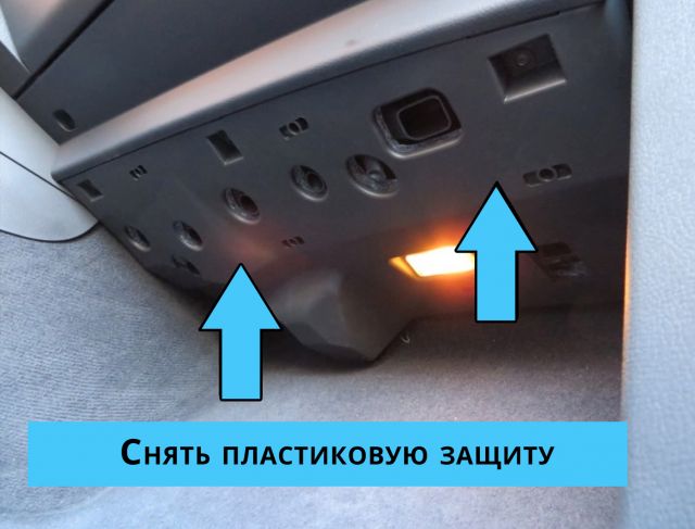 Залезть под бардачок и выкрутить три винта пластиковой защиты. Снять защиту и отсоединить разъем на подсветку. Затем осторожно снять пластиковый дефлектор и отодвинуть в сторону крышку салонного фильтра.