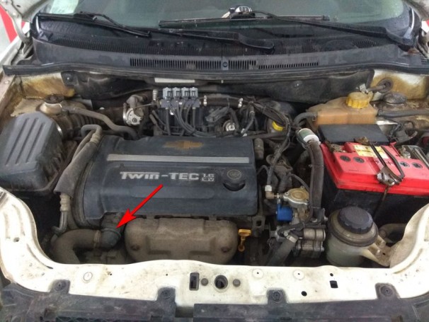 Двигатель CHEVROLET Aveo 1,6. Термостат указан стрелкой.
