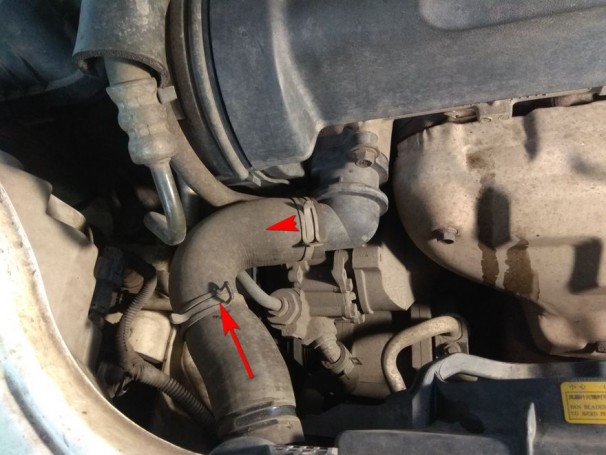 Снимаем еще один патрубок с корпуса термостата и убираем его в сторону.