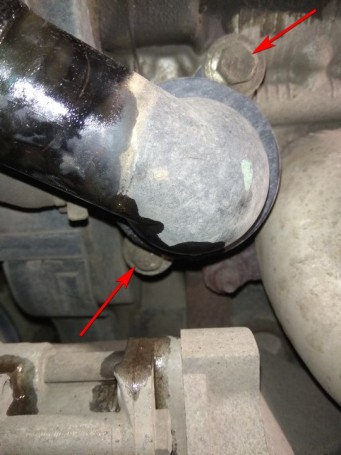 8Откручиваем два болта крепления термостата ключом на 12мм.