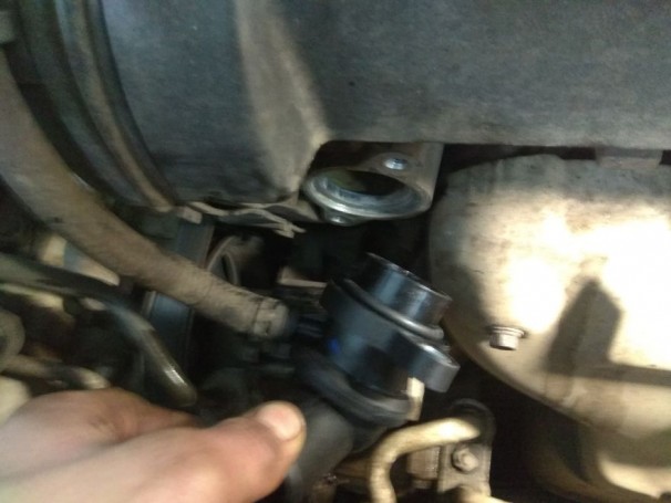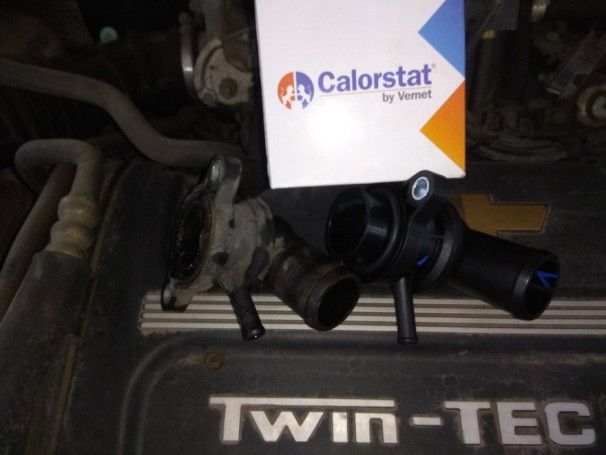 - Вынимаем неисправный термостат Шевроле Авео и на его место ставим новый.